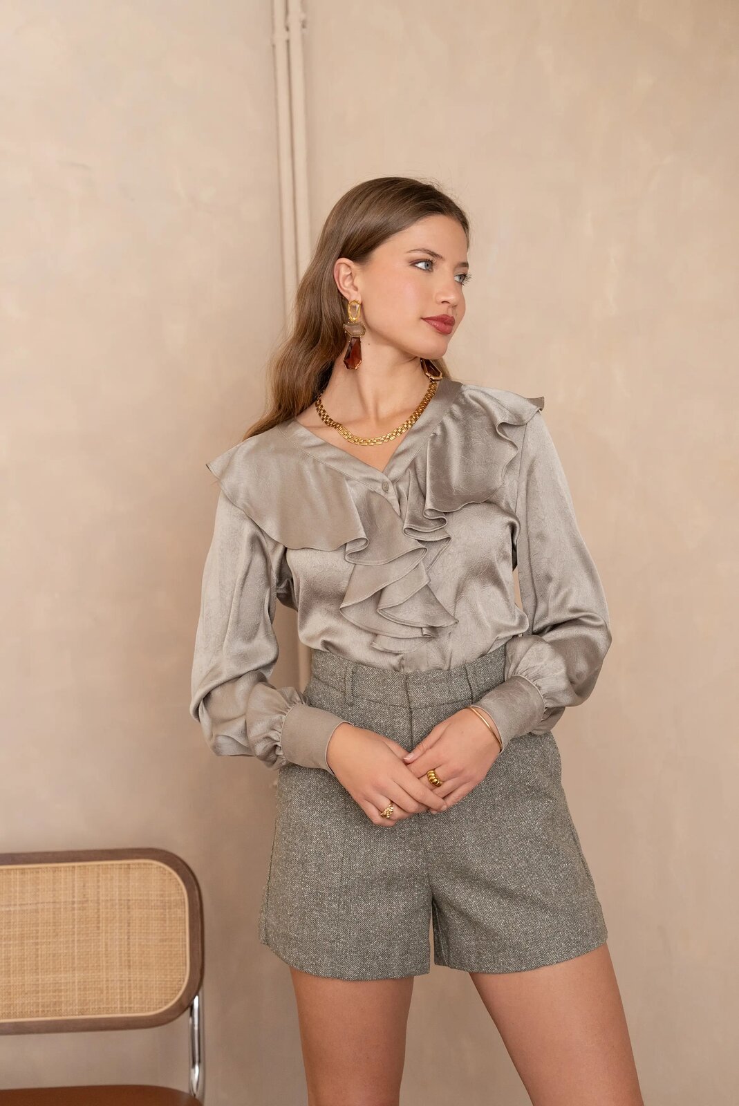 Met de Charlotte blouse (saliegroen) kies je voor een kledingstuk dat zowel overdag als in de avond tot zijn recht komt. De stof voelt zijdezacht aan op de huid en kreukt nauwelijks, waardoor je er de hele dag onberispelijk uitziet. De combinatie van de klassieke knoopsluiting en de moderne ruffles maakt dit een tijdloos item dat elke outfit direct naar een hoger niveau tilt.